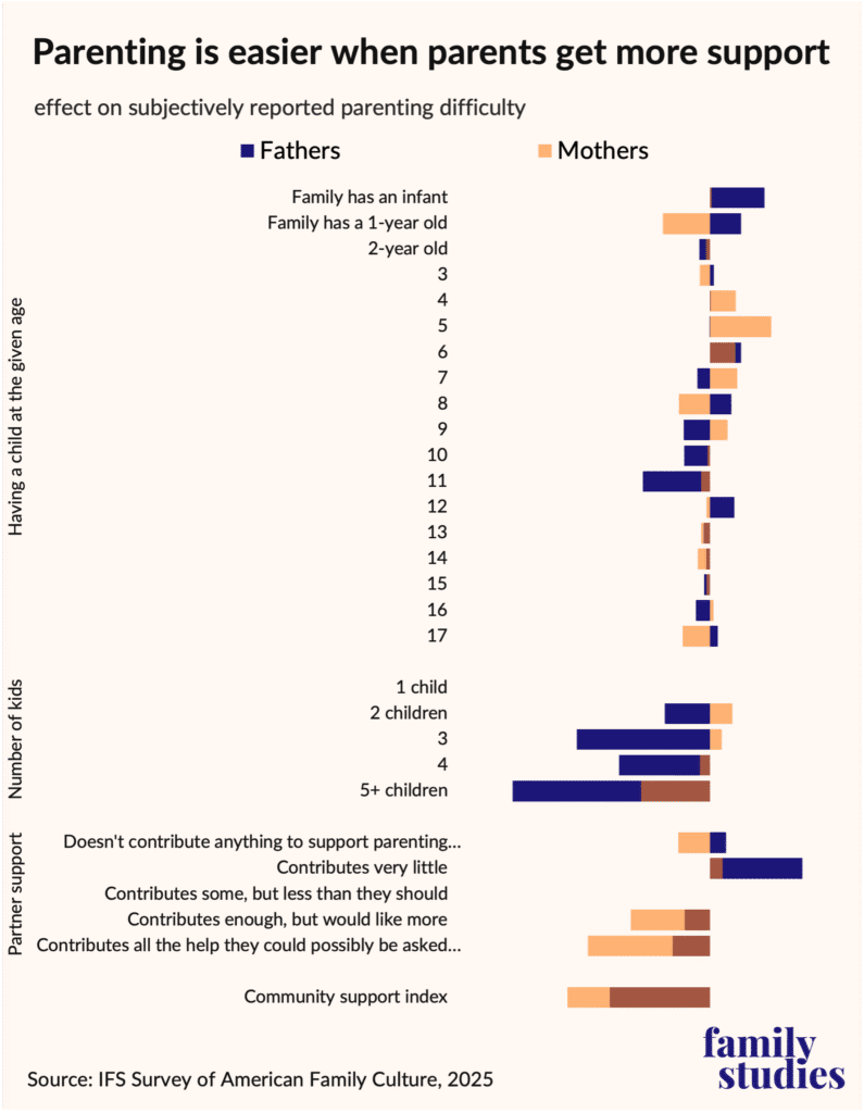 We recently surveyed 24,000 parents around the United States. One question we asked is on a lot of parents’ minds: how difficult is parenting? Many parents feel stressed or burdened by raising kids and would like to make it easier: 7.4% of parents in our survey say parenting is “very hard,” and 36.5% say it is “fairly hard.” We wondered if our data could point to ways in which parents could lighten their own load—both because we think parents could use a break, and because parents who describe parenting as easier are likelier to say they will have more children. Controlling for the number of kids, 48% of those who say parenting is very easy intend more children, vs. 38% of those who say parenting is fairly easy, 35% of those who say parenting is fairly hard, and 33% of those who say parenting is very hard. When parenting is too hard, fewer children are born.