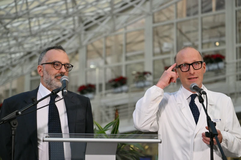 Dr. Sergio Alfieri (right) and Dr. Luigi Carbone give a press conference at Gemelli Hospital in Rome, where Pope Francis is hospitalized for tests and treatment for bronchitis, on Feb. 21, 2025. Alfieri said the pope asked him to say hat he has “the mind of a a 50-year-old man.” / Credit: ALBERTO PIZZOLI/AFP via Getty Images