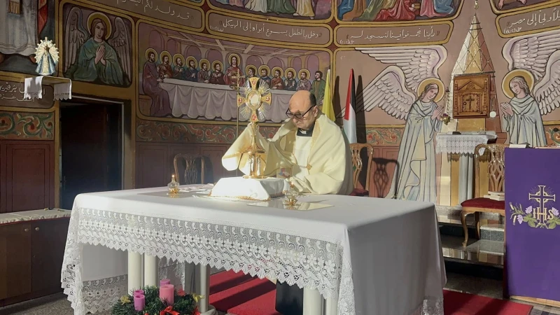 Father Gabriel Romanelli, pastor of Holy Family Parish in Gaza, leads Eucharistic adoration at the parish in December 2024. / Credit: Photo courtesy of Father Gabriel Romanelli