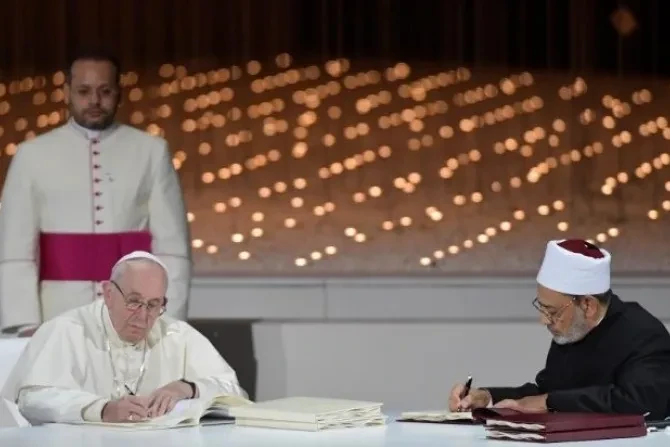 Pope Francis and Grand Imam Ahmed al-Tayeb sign the Document on Human Fraternity for World Peace and Living Together in 2019 . / Credit: Vatican Media